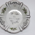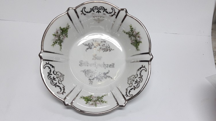 licznymi srebrnymi ornamentami. Delikatna kwiatowa dekoracja wykonana techniką kalkomanii. Krawędz srebrzona. W lustrze napis w języku niemieckim: Zum Silberhochzeit.