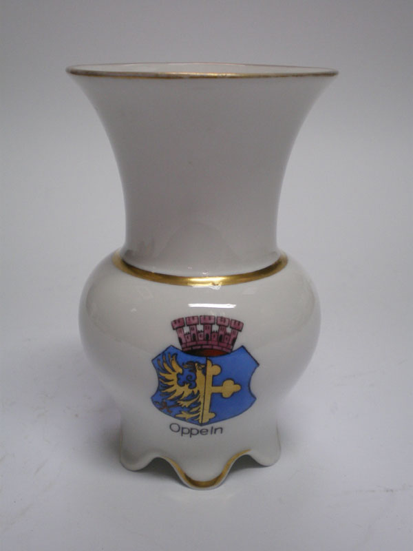 Kolekcjonerski wazonik z herbem OpolaPorcelana ze śląskiej wytwórni porcelany w TułowicachSygnatura z lat 30-tych.Klasyczna forma, śnieżna biel porcelany i złocenia na krawędziach.Na brzuścu herb przedwojennego Opola.