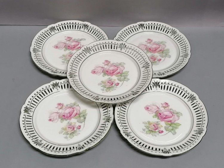 Pięć ślicznych talerzyków deserowych.