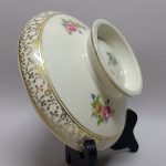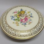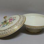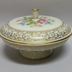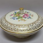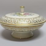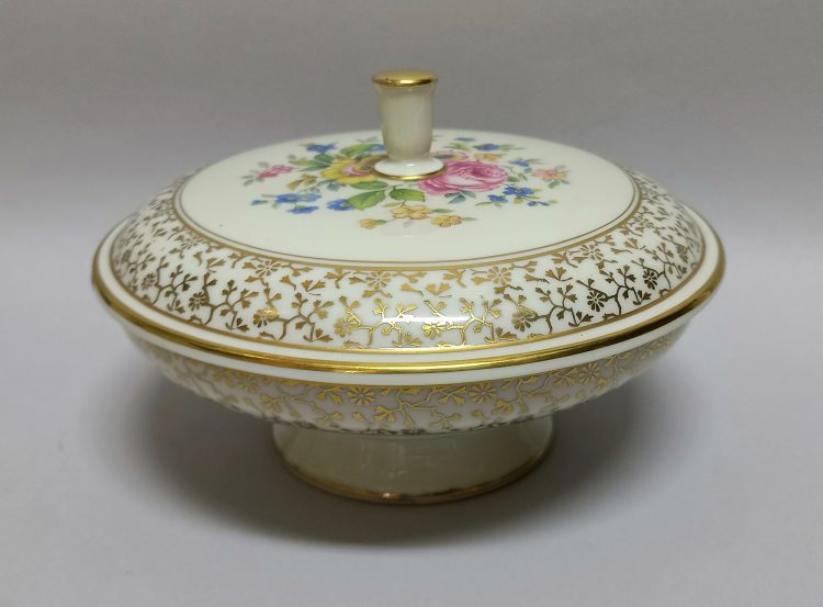 drobnych złotych kwiatków. Na pokrywie barwny, kwietny bukiet – kalkomania.