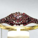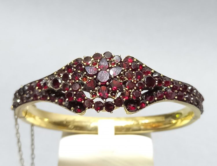 Wykonana z metalu złoconego i granatów.