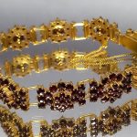 Wykonana z mosiądzu złoconego i granatów.