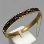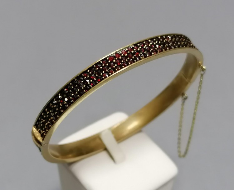Wykonana z mosiądzu złoconego i granatów.
