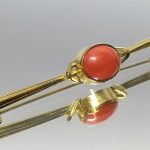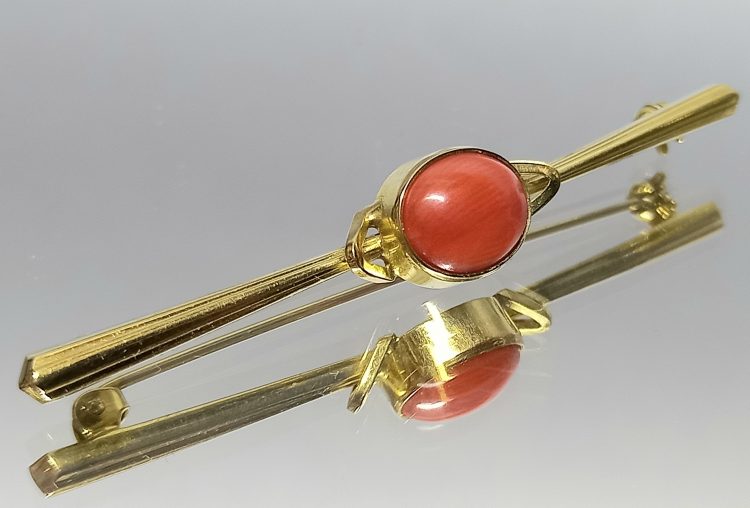 Prosta forma szpilki z centralnie osadzonym, owalnym koralem.