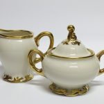 Porcelana w kolorze kremowym suto złocona na uchwytach i krawędziach.