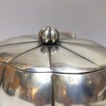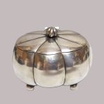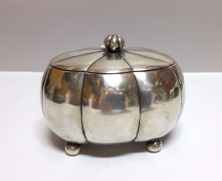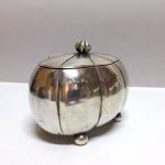 Owalna, pękata forma na czterech nóżkach kulkach, pokrywa na zawiasie