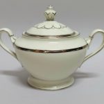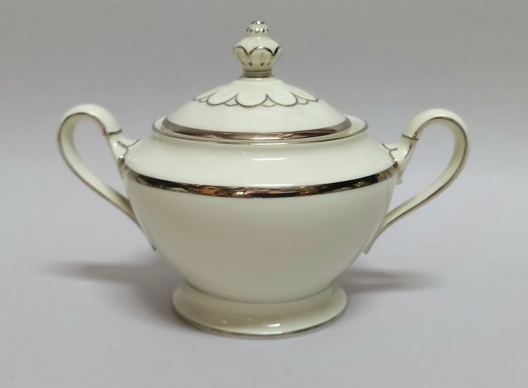 Delikatna, kremowa porcelana zdobiona na krawędziach srebrzeniem.