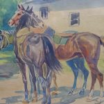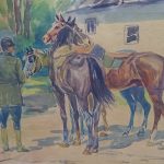Barwna scenka rodzajowa – dżokej stoi obok pięknych koni,