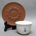 Dekorowany kwiatowym reliefem, sygnowany wyciskiem w masie – skrzyżowanymi mieczami.
