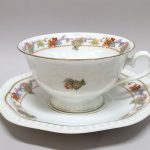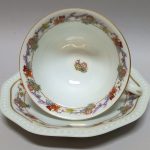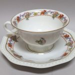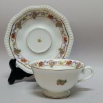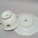 Filiżanka lekko rozkloszowana, spodeczek wielokątny.