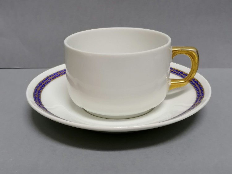Spodeczek z innego modelu, dekorowany kobaltowo – złotą bordiurą