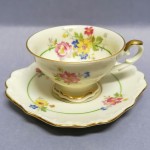 Delikatna, kremowa porcelana zdobiona barwną kwiatową kalkomanią.