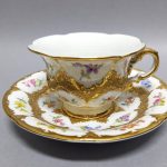 Krawędzie naczyń, uszko filiżanki oraz reliefy – suto złocone.