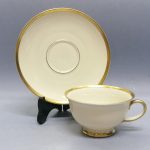 Delikatna porcelana w kolorze kości słoniowej złocona na krawędziach.