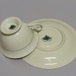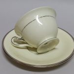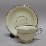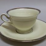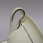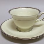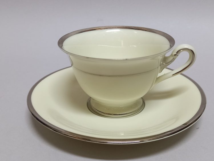 Delikatna, kremowa porcelana zdobiona na krawędziach srebrzeniem.