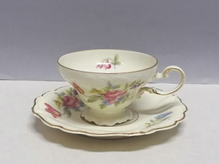 Śliczna forma filiżanki – na stopce. Krawędzie złocone.