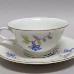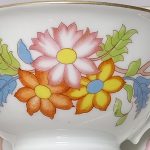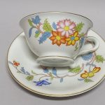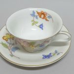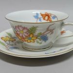 Cieniutka, śnieżnobiała porcelana dekorowana barwną kalkomanią.