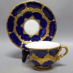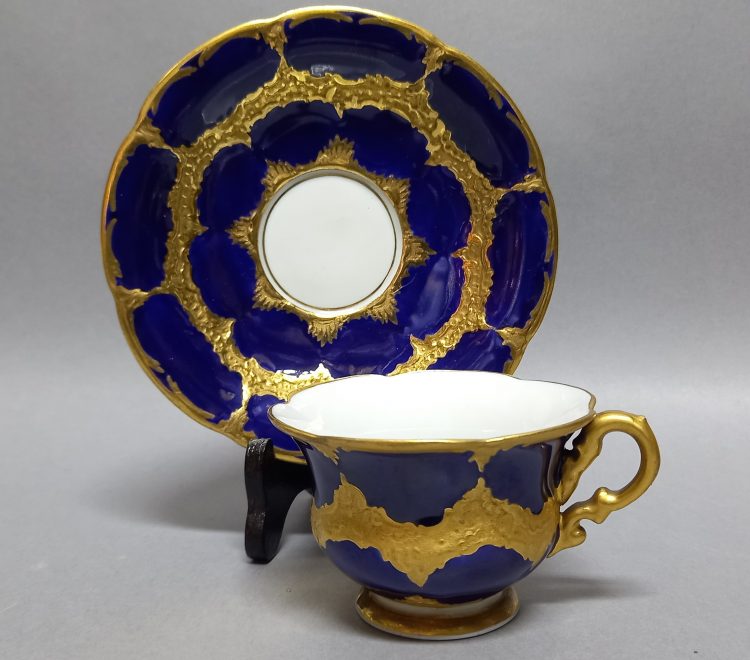 Śnieżnobiała porcelana bogato dekorowana prawdziwym kobaltem i złoceniami.