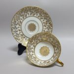 Delikatna, cieniutka porcelana w odcieniu kremowym,  zdobiona licznymi złoceniami.