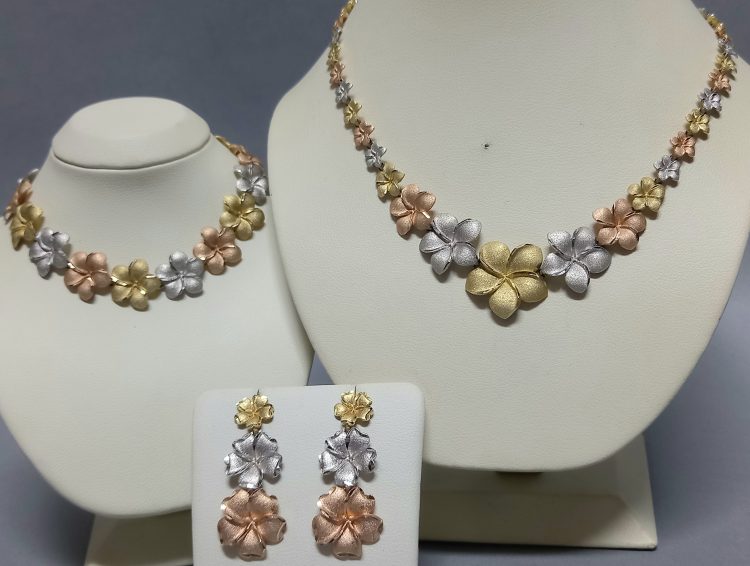 Złoto próby 585 w trzech kolorach: białym, żółtym i różowym.