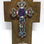 Krzyż i pojemnik na święconą wodę prześlicznie dekorowane emalią.