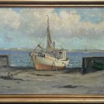 Nastrojowa marina – kuter na brzegu .