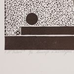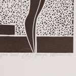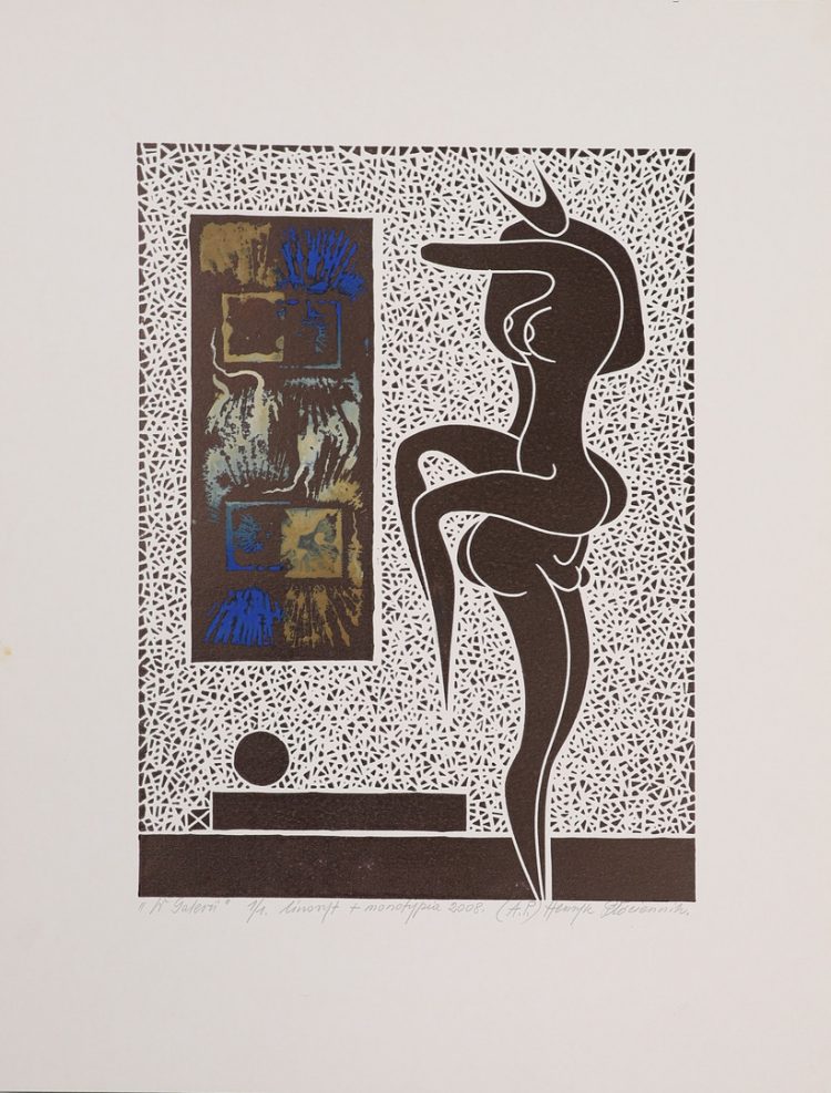 po lewej: „W galerii ” „1/1”, po środku: „linoryt monotypia 2008.”, po prawej: „(A.P.)” „Henryk Płóciennik”.