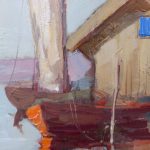 Skandynawski pejzaż – rybackie łodzie cumujące przy chacie, tuż przy samym brzegu.