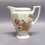 Śnieżnobiała porcelana dekorowana na brzegach charakterystycznym reliefem. Barwna, kwietna dekoracja wykonana techniką kalkomanii – wzór Sommerstrauss, tzw. letni bukiet.