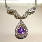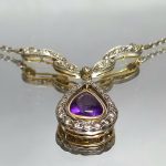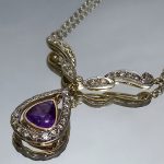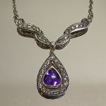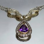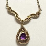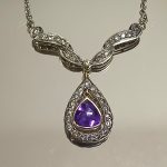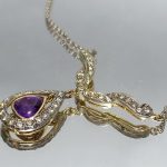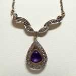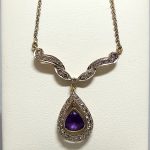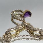 wykwintny dekor ze zwisającą łezką, pośrodku której znajduje się piękny ametyst (1ct).