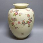 Kremowa porcelana zdobiona uroczym, kwietnym motywem wykonanym techniką kalkomanii.