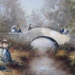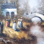 Romantyczna scenka parkowa: spacerujący wzdłuż rzeczki, w tle mostek, przeszklona altana.