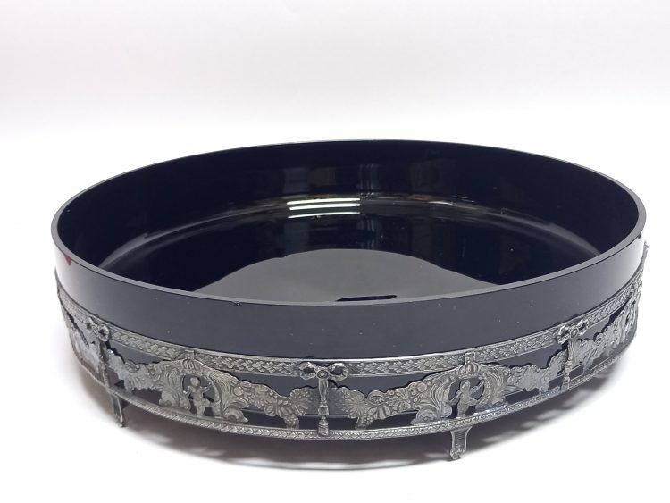 Ażurowy, misternie dekorowany koszyczek wykonany ze srebrzonego metalu.