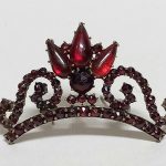 Oryginalna forma broszy w kształcie diademu oraz szlifowane, ciemne granaty dają wspaniały efekt.