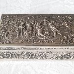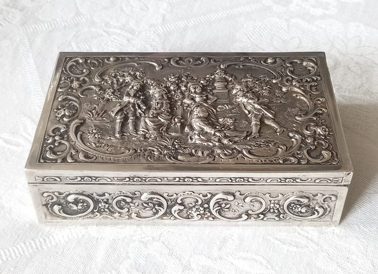 na bokach motywy floralne a na pokrywie romantyczna scenka rodzajowa.
