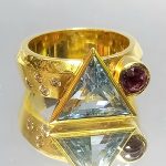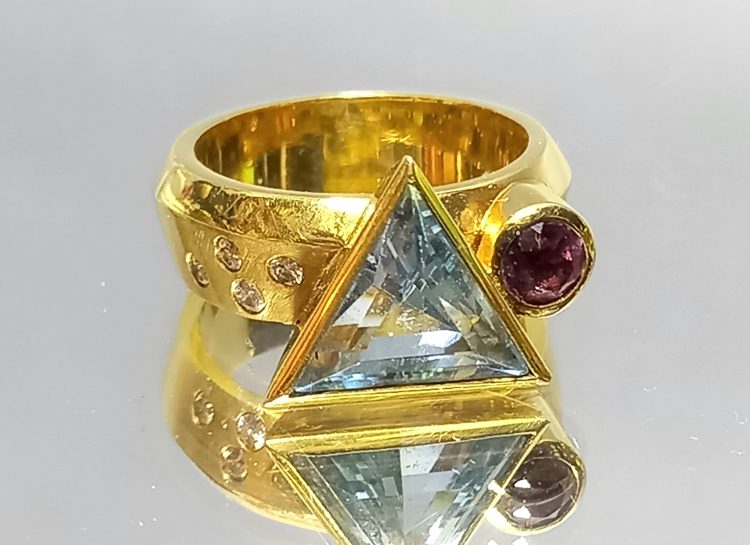 W części centralnej przejrzysty – trójkątny akwamaryn oraz okrągły ametyst (0,3ct).