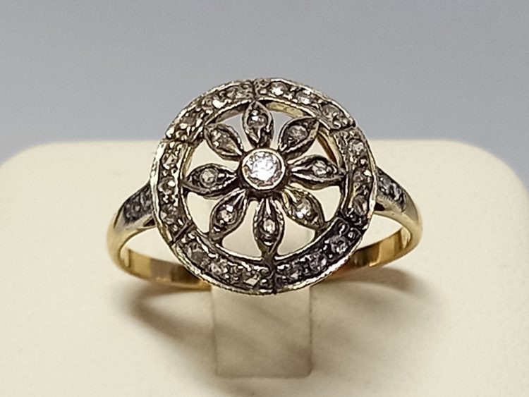 delikatny pierścionek z ażurowym, okrągłym oczkiem w kształcie kwiatka.