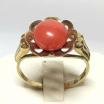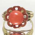 Pierścionek z dużym, okrągłym koralem. Ażurowa oprawa jak płatki kwiatka.