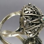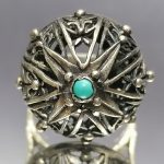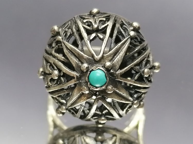 Pierścionek misternie wykonany, turkusik osadzony na szczycie ażurowej kopułki.