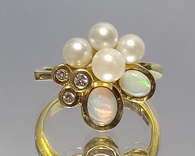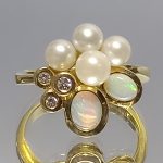 Piękny pierścionek z opalami, perłami i diamentami.