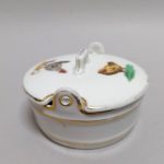 Biała porcelana zdobiona na pokrywce zabawną kalkomanią – barwne kurki.