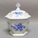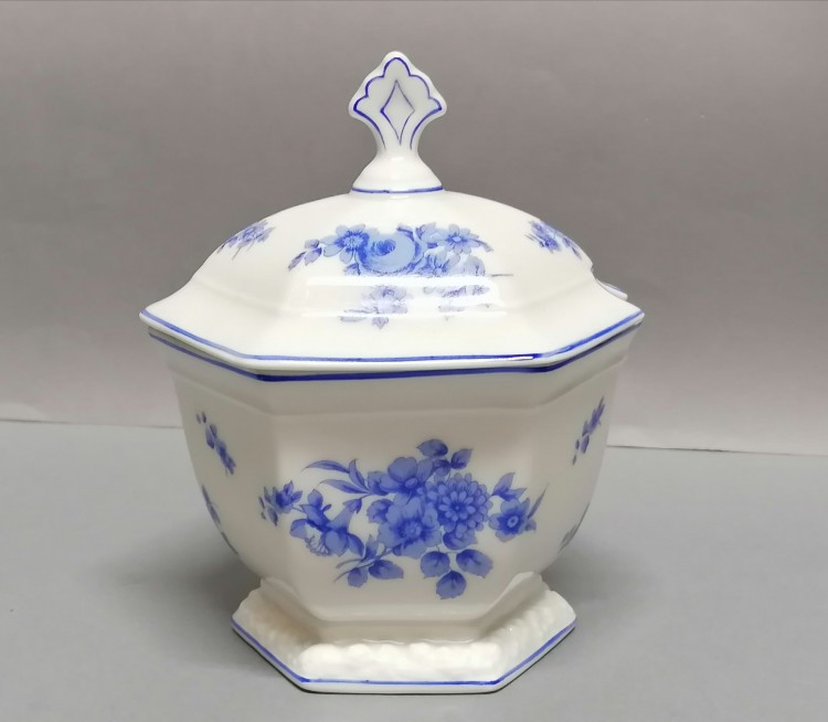 Delikatny dekor – błękitne kwiaty, wykonany techniką kalkomanii.