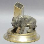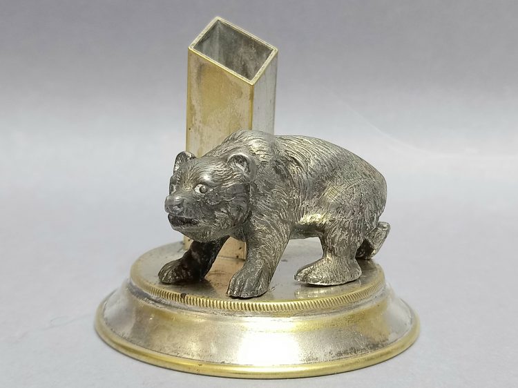 Figurka niedźwiadka wykonana z cyny srebrzonej.