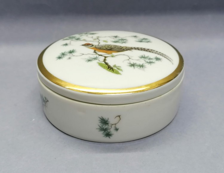 Na pokrywie dumny bażant w całej okazałości – technika kalkomanii.-