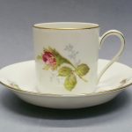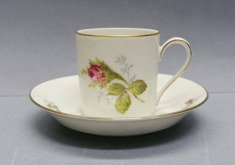 Śnieżnobiała, delikatna porcelana dekorowana barwną kalkomanią – motyw róży.