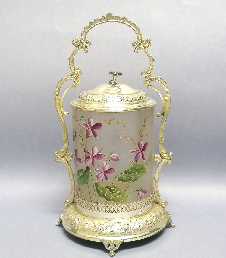 Pokrywa i podstawa z fantazyjnym uchwytem, wykonane z niklowanego mosiądzu.