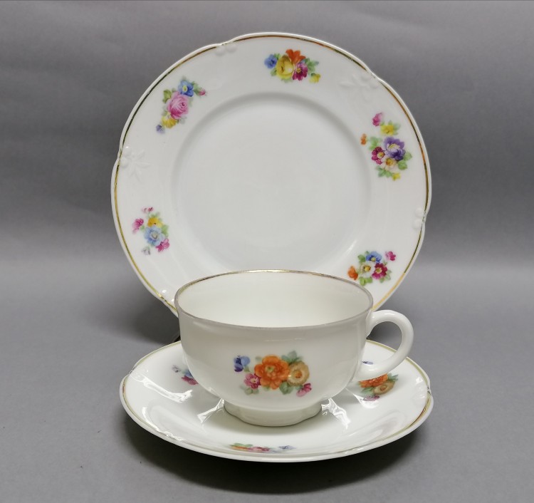 Śliczna filiżanka w towarzystwie spodka i talerzyka deserowego.