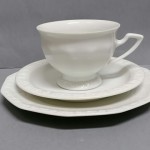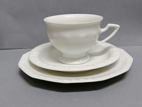Śnieżnobiała porcelana zdobiona na brzegach charakterystycznym reliefem.