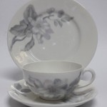 Herbaciana filiżanka ze spodkiem i talerzykiem deserowym.
