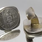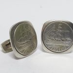 Spinki w formie kwadratu, na którym umieszczone zostały przedwojenne monety